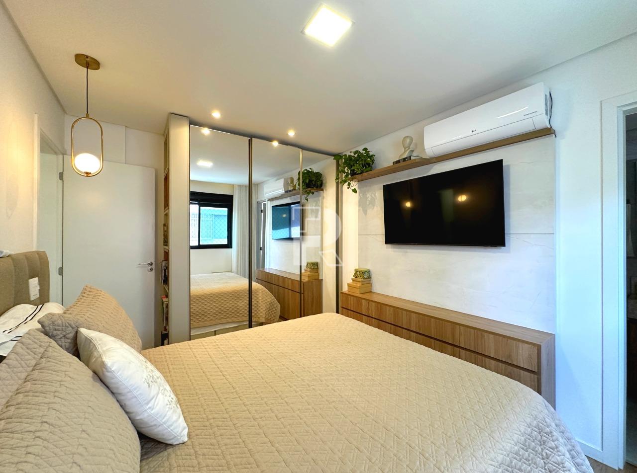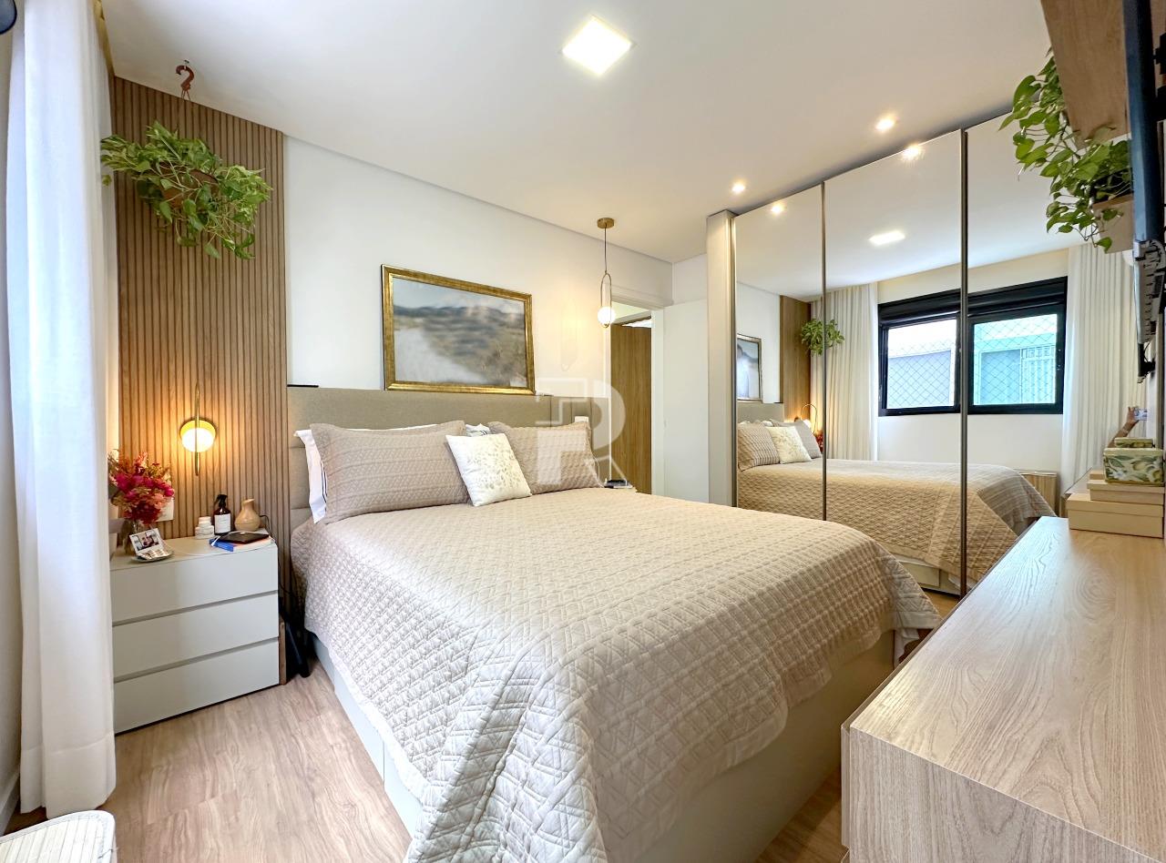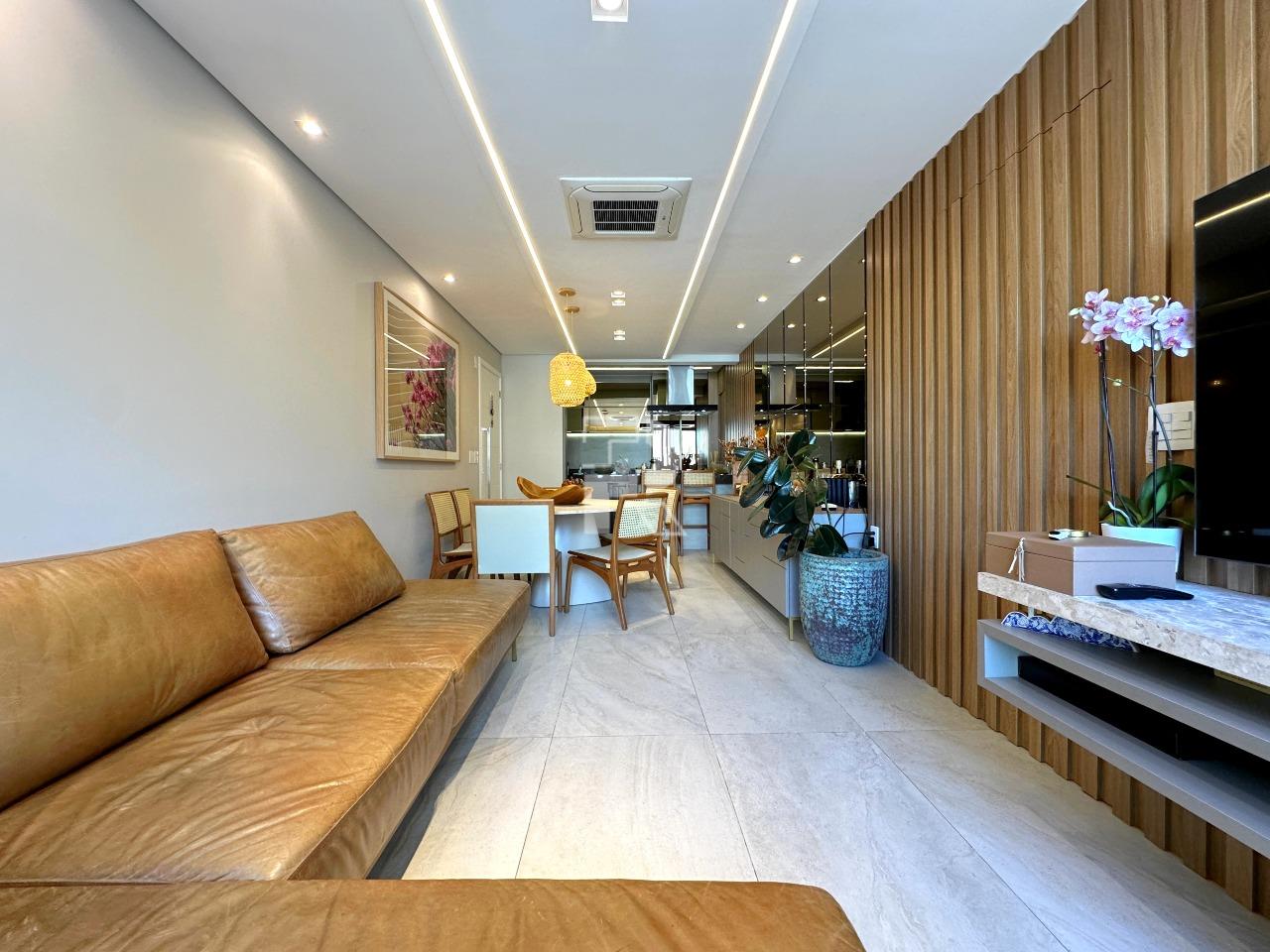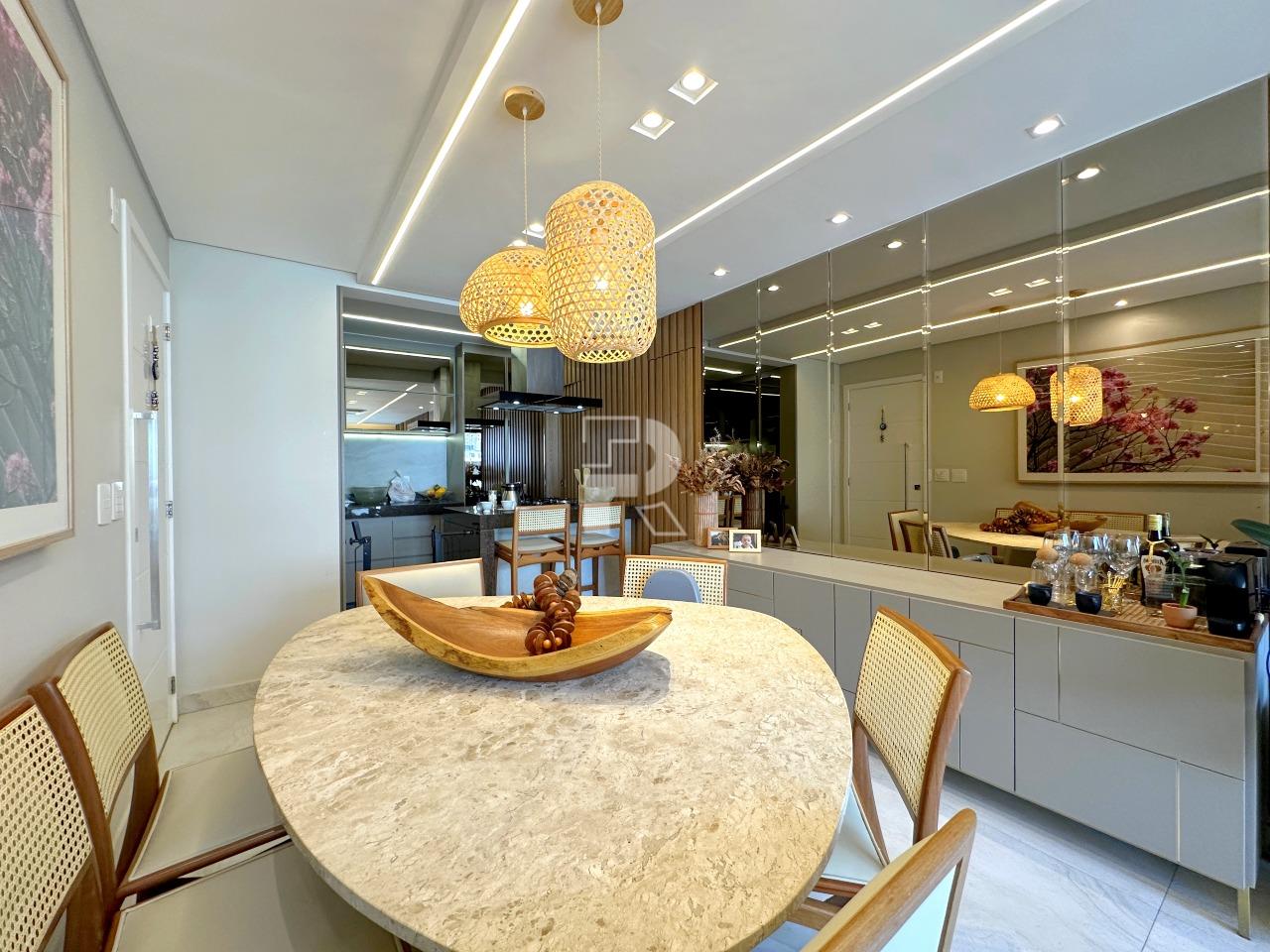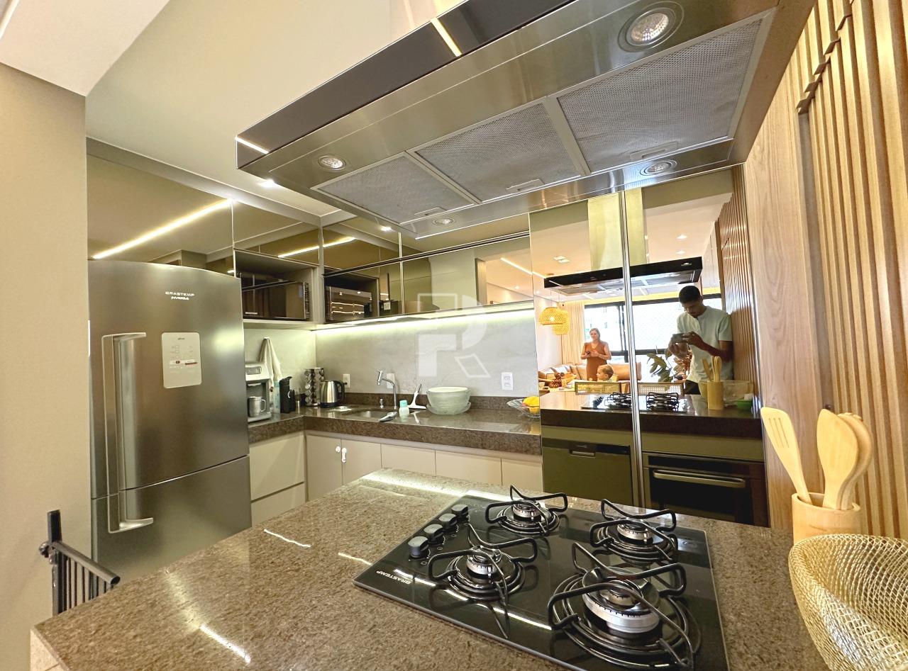 Sala para dois ambientes com piso em porcelanato, teto rebaixado, projeto de iluminação, ar condicionado central, marcenaria completa e janela ampla; 03 quartos sendo uma suíte, e duas semi-suítes, todos os quartos com piso em vinílico, ar-condicionado e armários planejados; banho social e suíte 100% revestidos, box, armários e espelhos; cozinha com armários planejados, coifa, bancada americana em granito e piso em porcelanato; área de serviço independente.