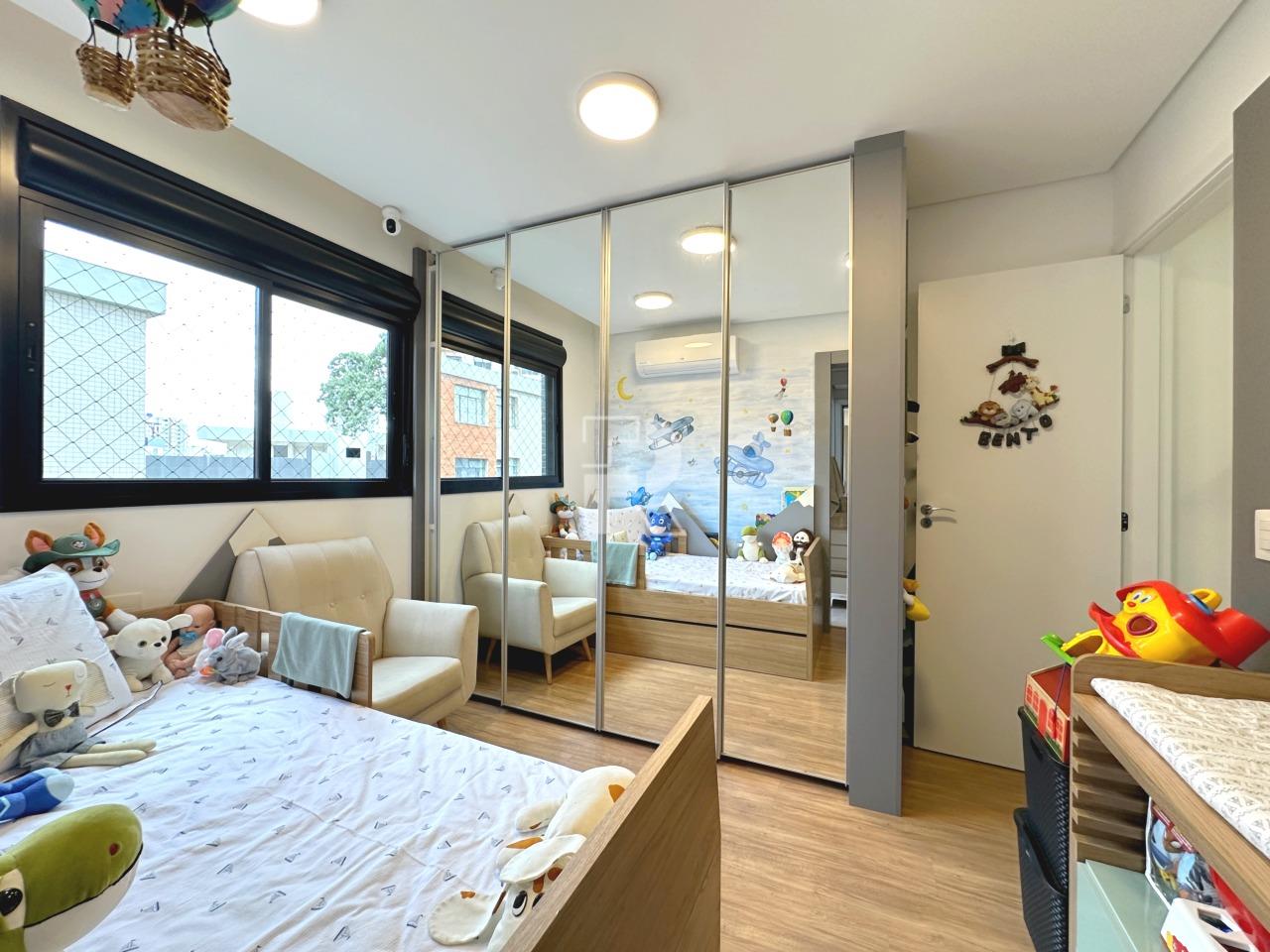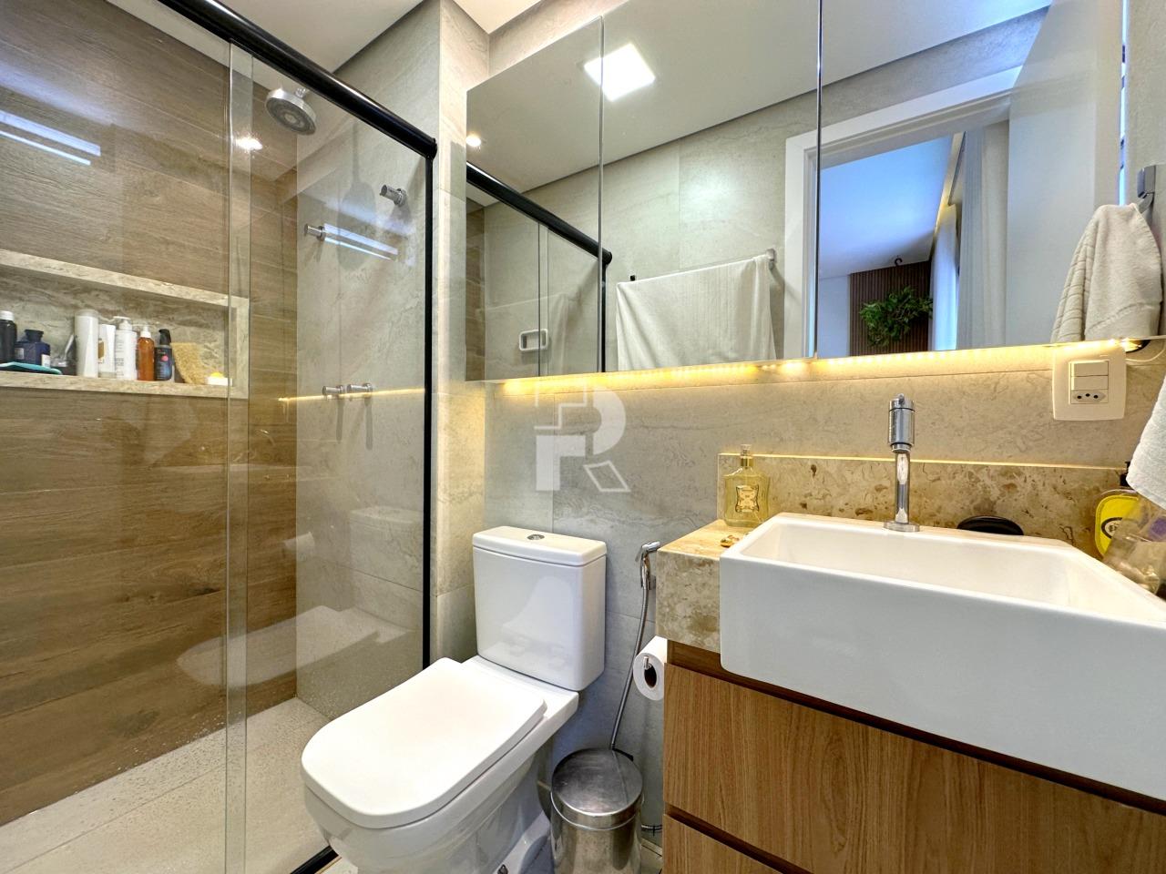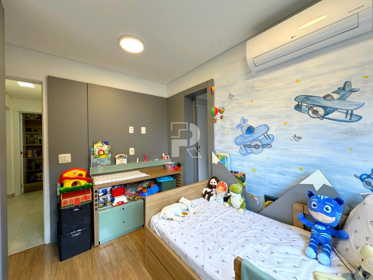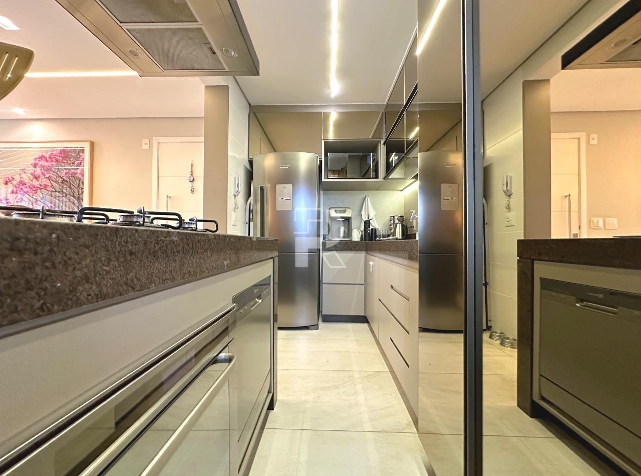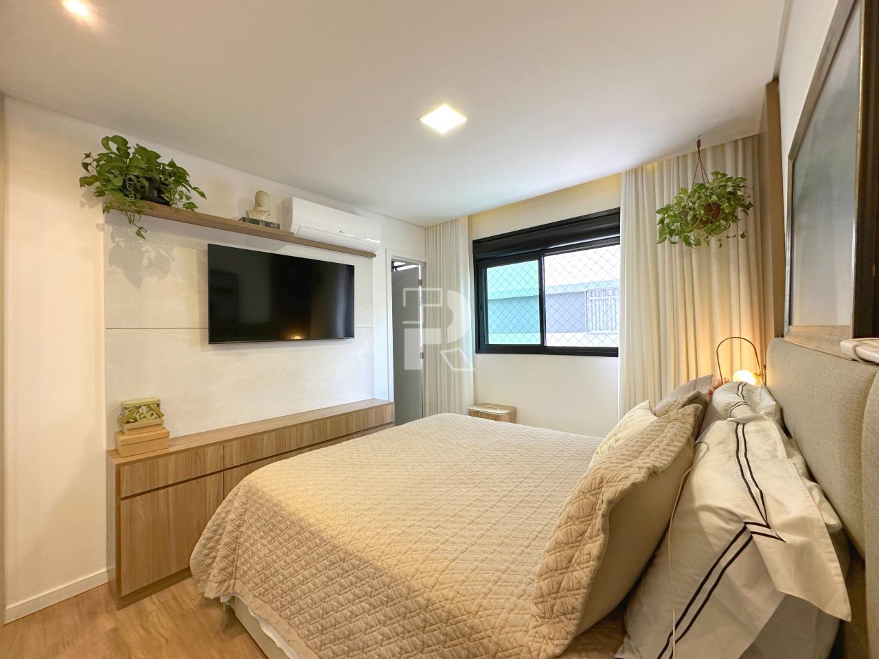 Sala para dois ambientes com piso em porcelanato, teto rebaixado, projeto de iluminação, ar condicionado central, marcenaria completa e janela ampla; 03 quartos sendo uma suíte, e duas semi-suítes, todos os quartos com piso em vinílico, ar-condicionado e armários planejados; banho social e suíte 100% revestidos, box, armários e espelhos; cozinha com armários planejados, coifa, bancada americana em granito e piso em porcelanato; área de serviço independente.
