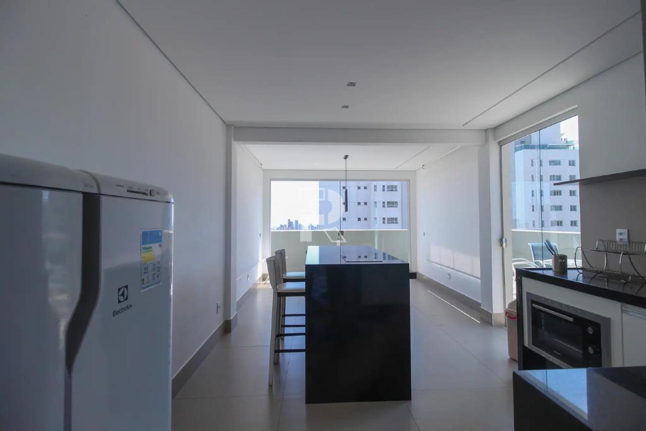 Sala com piso em cerâmica, rebaixamento em gesso e iluminação planejada com acesso à varanda; cozinha equipada com armários, bancada em granito e piso em cerâmica, integrada com área de serviço; quarto com piso em laminado de madeira, armário planejado e parede de espelho; banheiro social com acabamento em cerâmica e box em blindex; rouparia; 01 vaga coberta e demarcada com portão eletrônico.