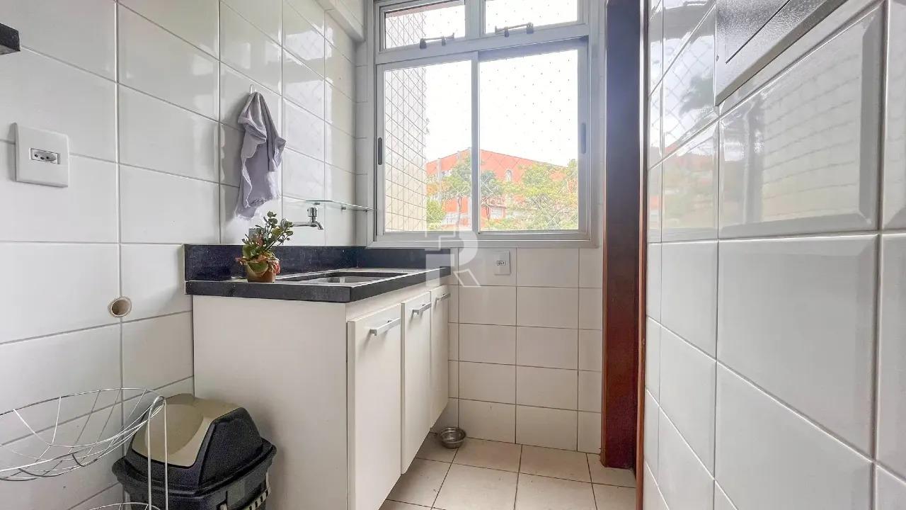 Cozinha espaçosa com armários planejados, bancada americana e piso em cerâmica. Área de serviço com armários e pia de apoio.
