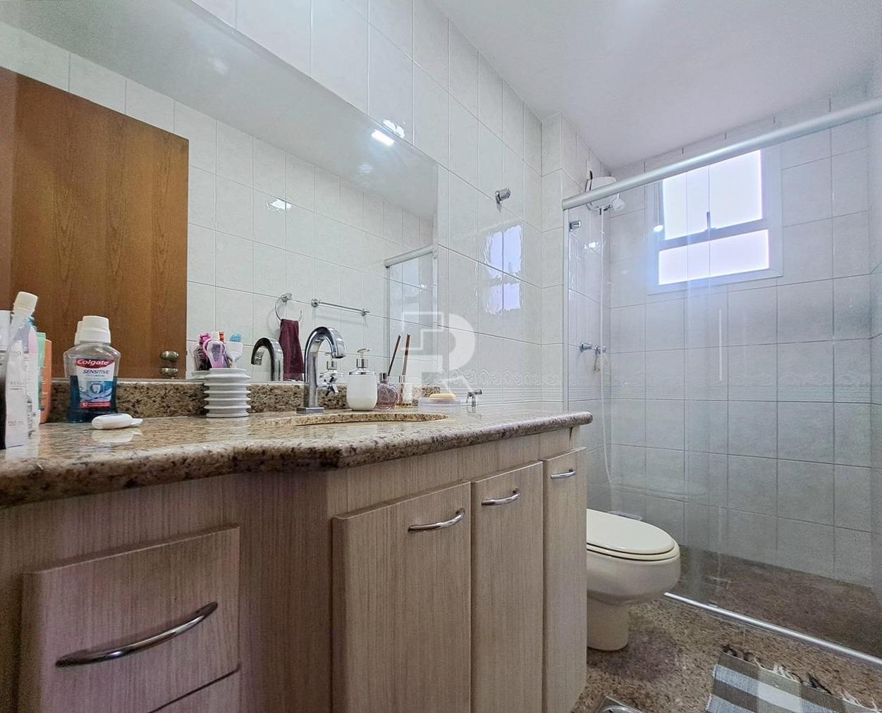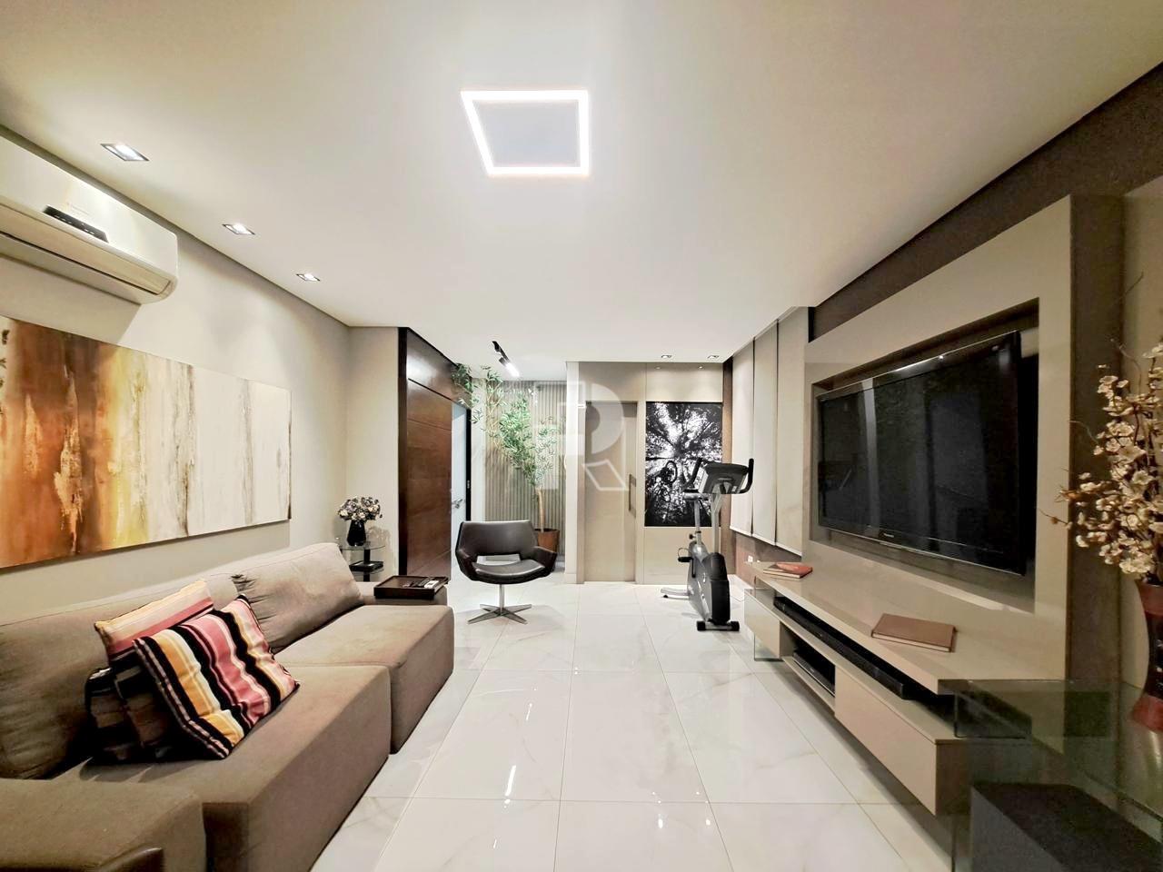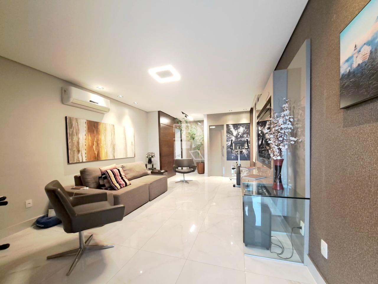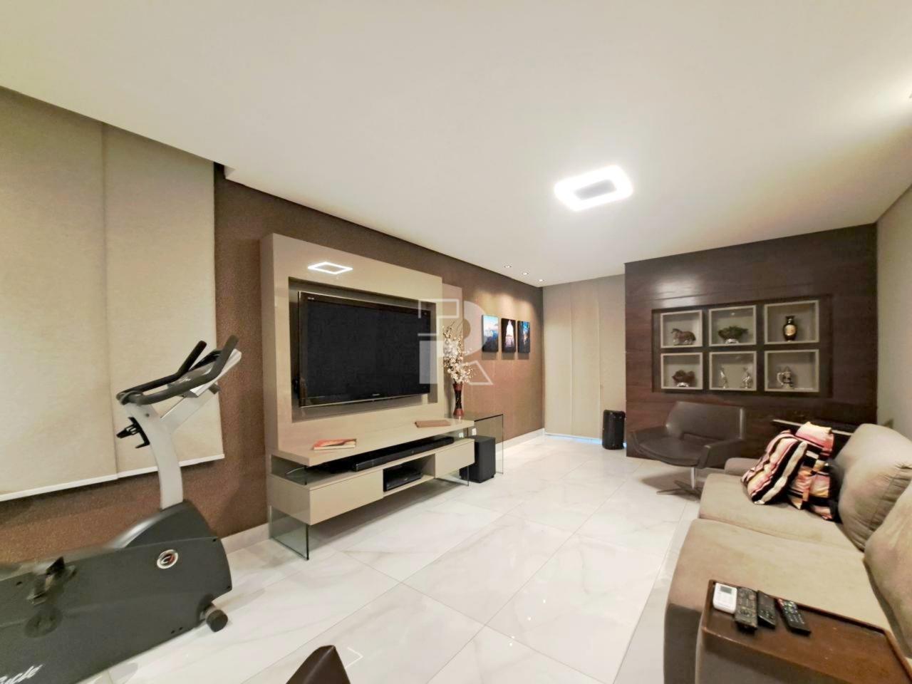 Sala para dois ambientes com piso em porcelanato, teto rebaixado em gesso, cristaleira e painéis planejados; 4 quartos sendo um suíte, todos os quartos com piso em madeira; banho social e suíte 100% revestido; cozinha planejada com bancada e piso em granito; área de serviço independente com DCE.