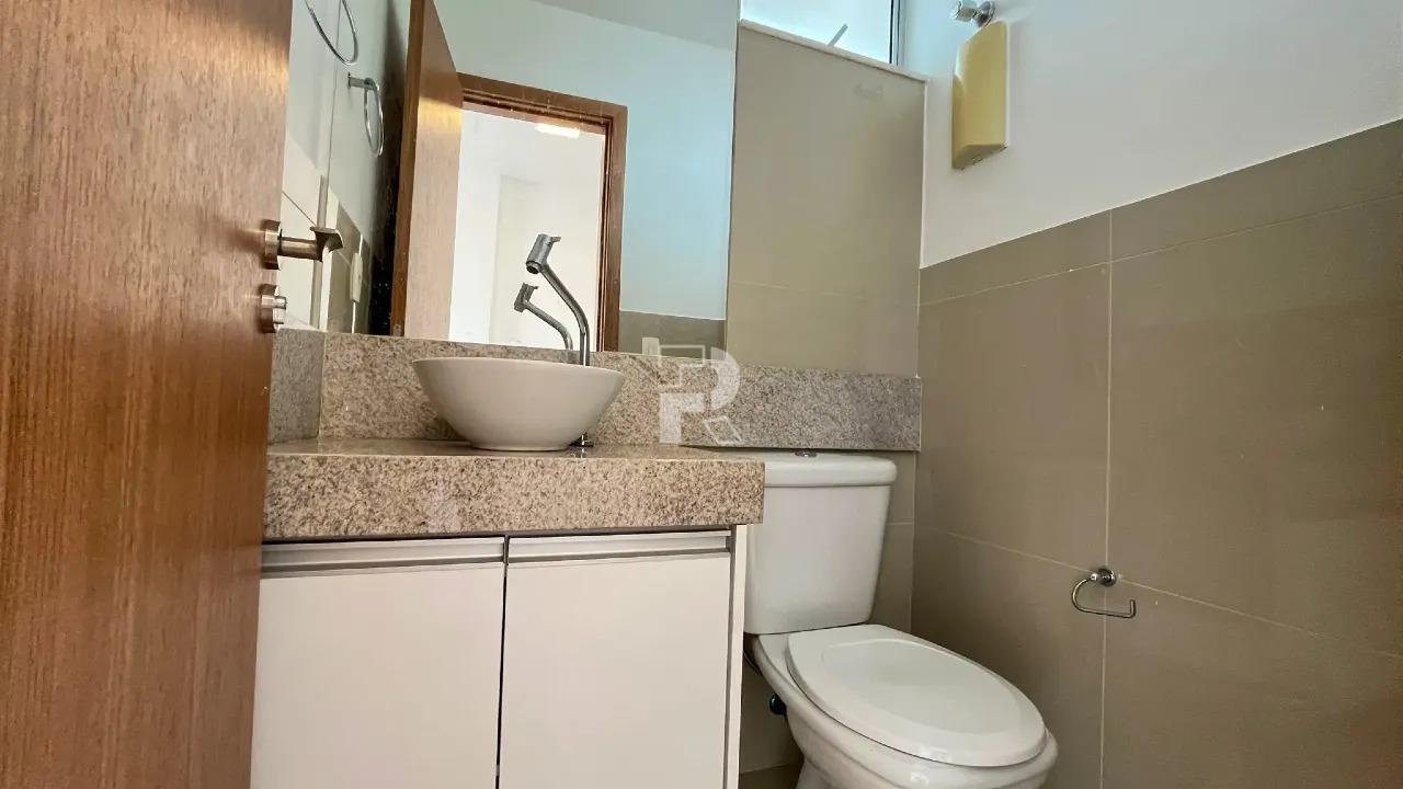 Banheiro social com armários, espelho e box em blindex.