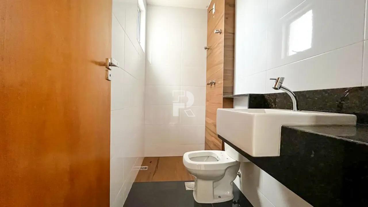 Banheiros suítes com bancada em granito, piso em porcelanato.